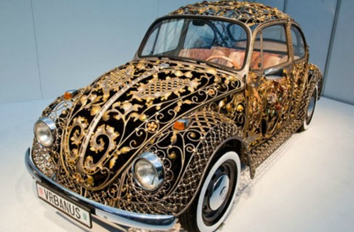 來自克羅地亞的一間鐵藝工作室Vrbanus的三位藝術(shù)家,花費(fèi)超過3500小時,手工打造出這輛1970款的大眾甲殼蟲汽車,外形復(fù)古優(yōu)雅。Vrbanus擅長生產(chǎn)優(yōu)雅的鐵藝大門和圍欄,這次打造這款甲殼蟲汽車更是充分展示了他們的實(shí)力,鐵藝設(shè)計精美,外圍鑲嵌金箔,內(nèi)部飾以手工真皮,整輛車因此增重420千克。